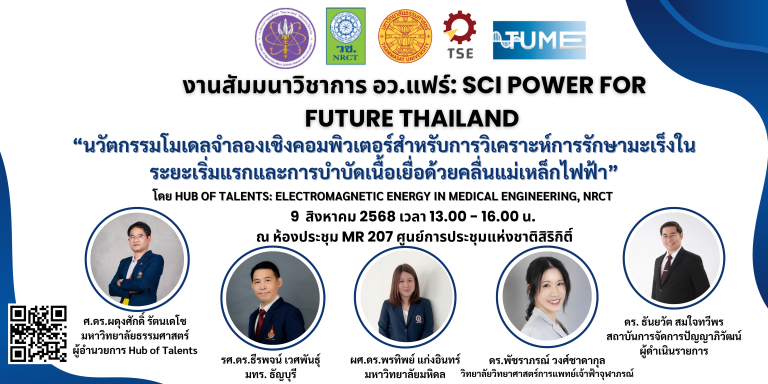 จัดการการเสวนา หัวข้อ นวัตกรรมโมเดลจำลองเชิงคอมพิวเตอร์สำหรับการวิเคราะห์การรักษามะเร็งในระยะเริ่มแรกและการบำบัดเนื้อเยื่อด้วยคลื่นแม่เหล็กไฟฟ้า โดยจัดขึ้นภายในงาน อว.แฟร์ : SCI POWER FOR FUTURE THAILAND มหกรรมส่งเสริมการใช้ประโยชน์จากองค์ความรู้ วิจัย และนวัตกรรม (อววน.) เพื่อขับเคลื่อนเศรษฐกิจไทยอย่างยั่งยืนด้วยพลังสหวิทยาการ ระหว่างวันที่ 9 – 17 สิงหาคม 2568 ณ ศูนย์การประชุมแห่งชาติสิริกิติ์